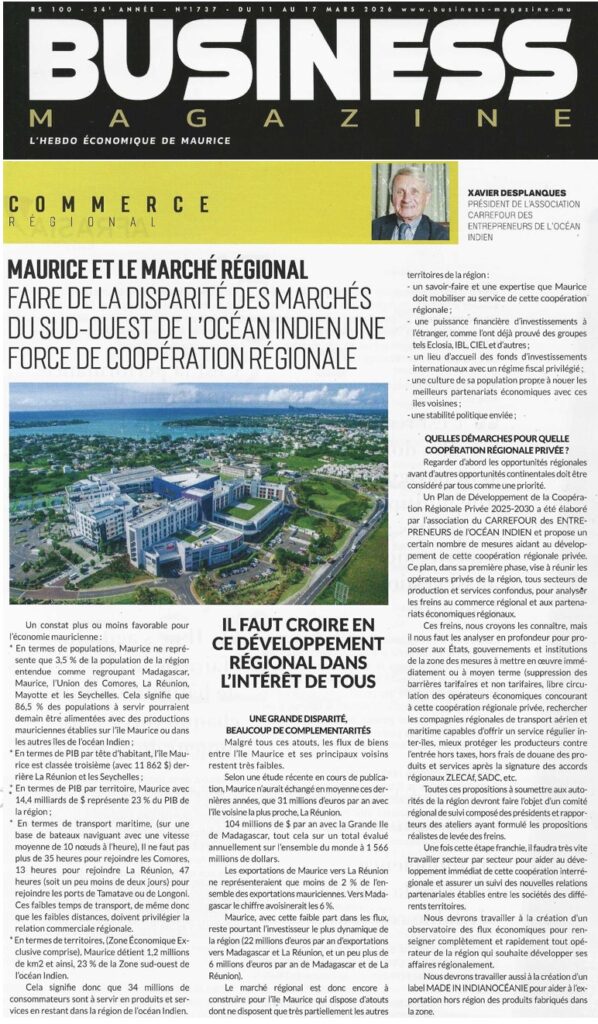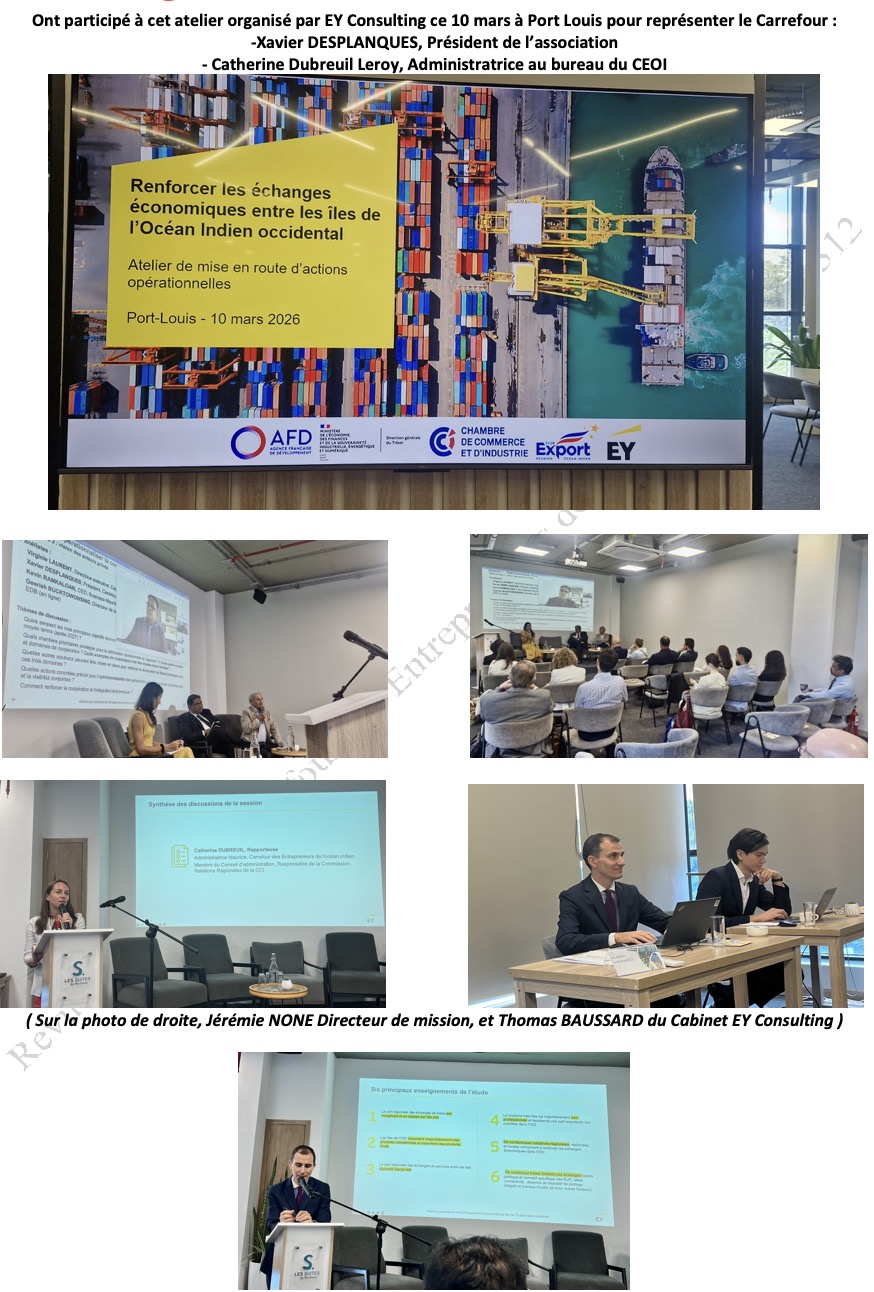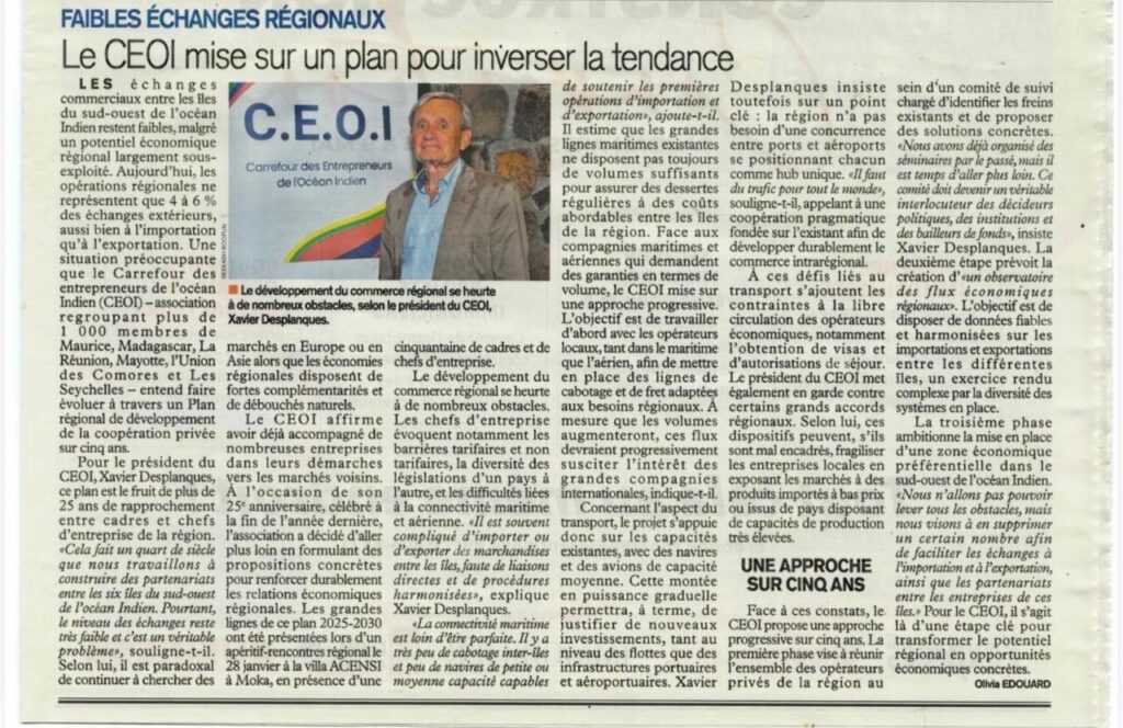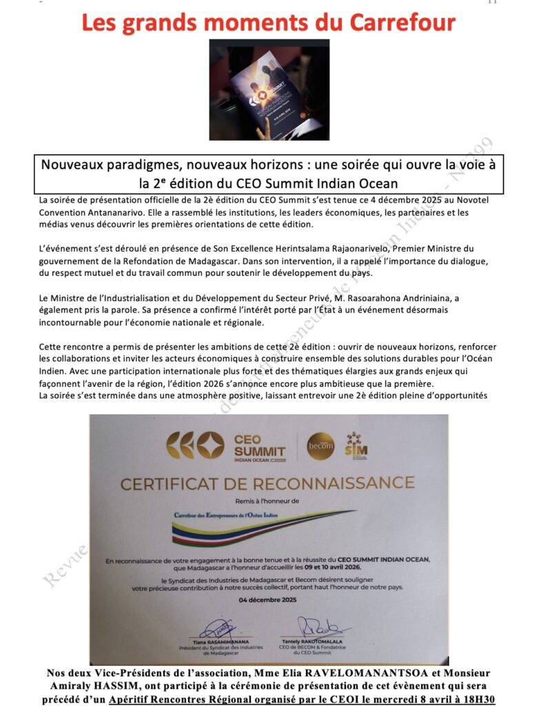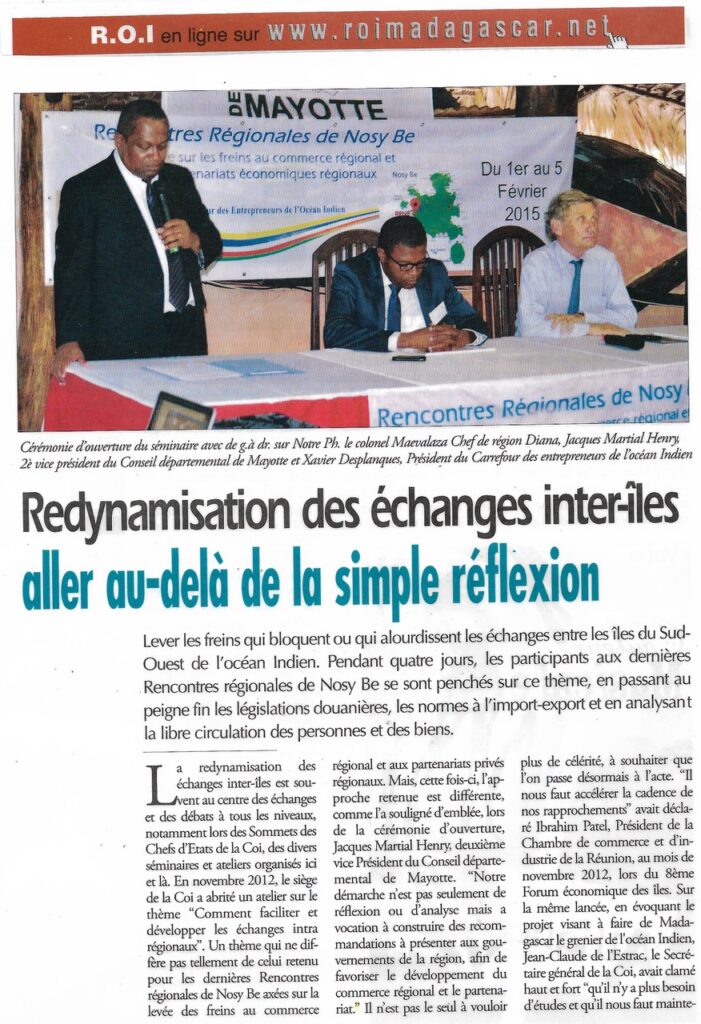 Le président du Conseil général de Mayotte dirigeait une importante délégation d’opérateurs économiques de son île. Invités par Mr Xavier Desplanques, président de l’association « Carrefour des entrepreneurs Européens » à Madagascar, les visiteurs mahorais ont rencontré quelque 240 chefs d’entreprises français qui représentent 50% de l’économie malgache. Au centre de ces rencontres coparrainées par l’ambassadeur de France, M. Jean Marc Chataigner et le Président du Conseil Général de Mayotte, des déjeuners et dîners débat, des rencontres Be to Be et des visites d’entreprises. Le 101ème département français est résolument décidé à se frayer un chemin dans l’espace économique régional.