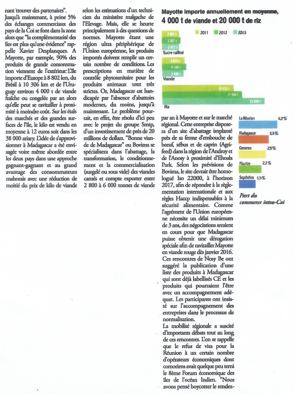 Plus important encore, les deux acteurs se sont accordés sur la règle de cofinancer les projets à développer dans l’avenir. Une nouvelle confiance s’installe peu à peu entre les deux partenaires qui ont entrepris de développer divers secteurs, notamment la pêche et de l’aquaculture (PHOTO) de Mayotte, alors qu’une foire agricole s’est tenue à Madagascar cette année.